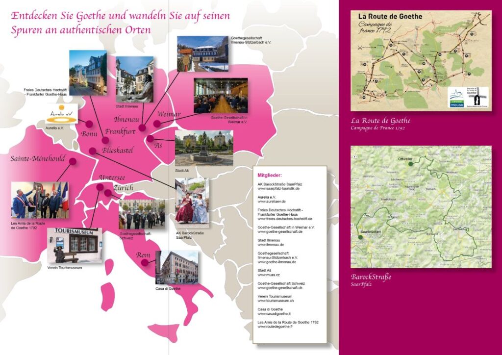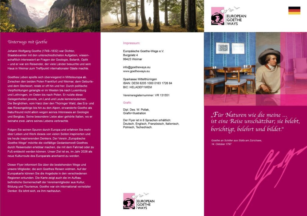 Tento nový leták informuje o existujících stezkách a dosavadních členech sdružení, kteří se věnují Goethovým cestám. Na mapě Evropy si můžete prohlédnout nabídky v jednotlivých regionech. Mapa také zobrazuje vznikající komunitu členů sdružení z oblasti kultury, vzdělávání a cestovního ruchu. Goethe byl skutečným nadnárodním filozofem, stojí za to následovat jeho příklad.